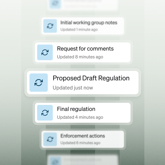 - Automated monitoring of 10,000+ government sources, from meeting notes to initial draft documents and enacted regulations and laws