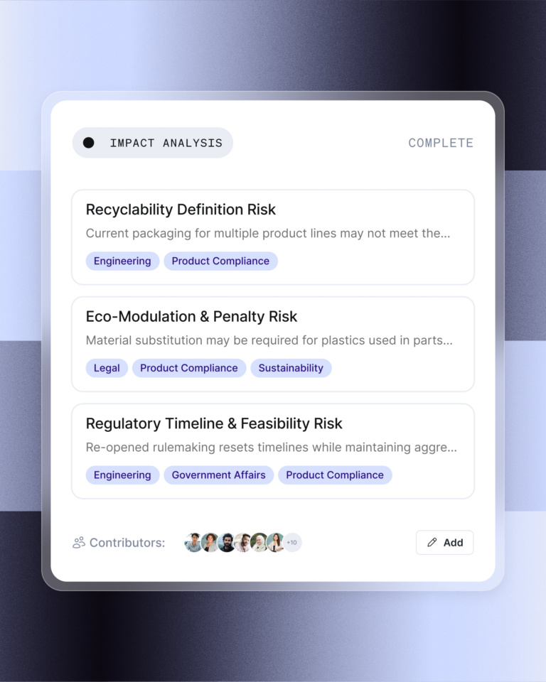 Updates are extracted in real time—from press releases and meeting notes to draft proposals and enacted laws—and normalized into a consistent format.